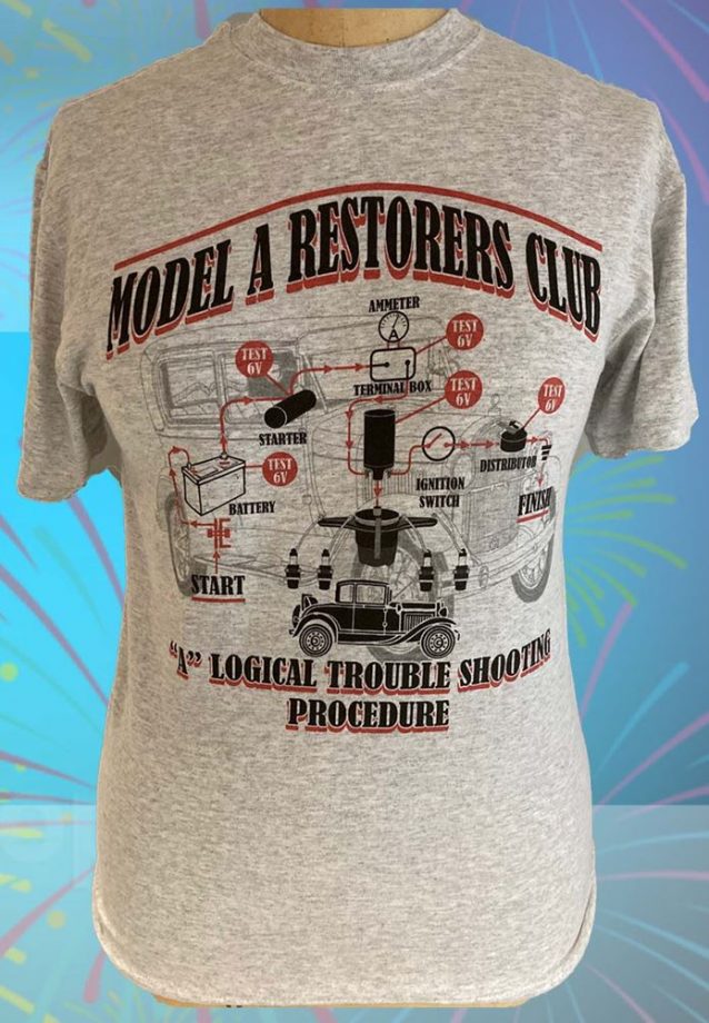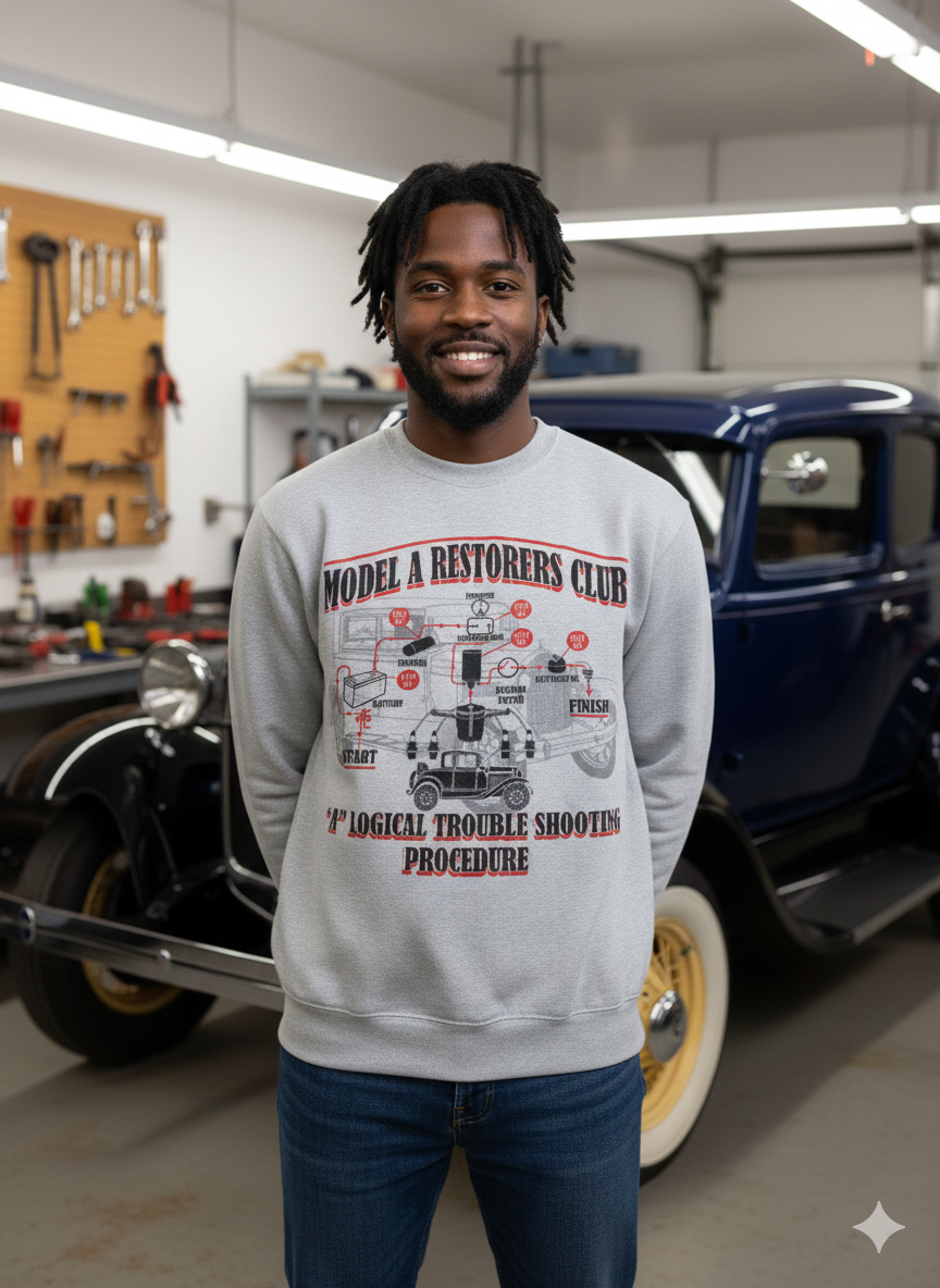 Model “A” Restorers Club “A” Logical Trouble Shooting Procedure Sweatshirt. Gray 99% cotton 1% polyester blend. This 2 color on gray heavy shir is sure to keep you warm in the garage this fall and winter.