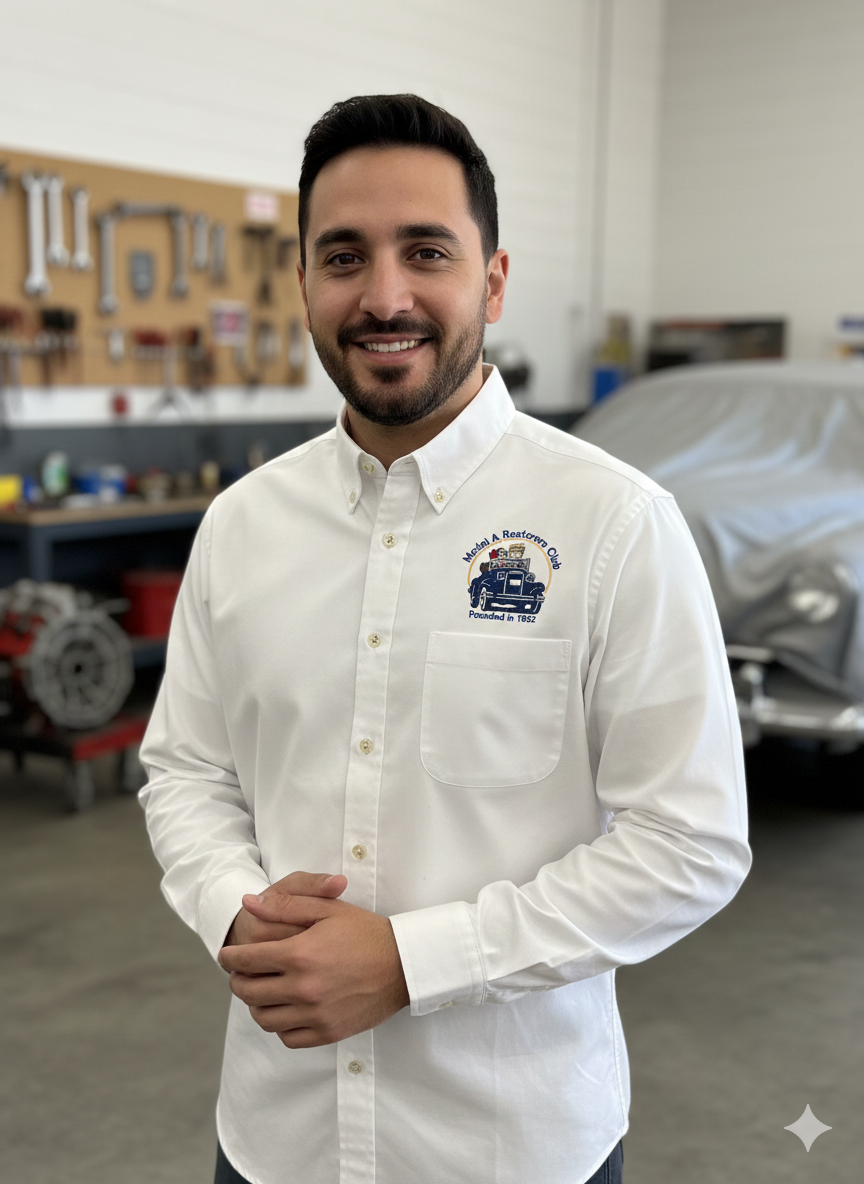 White poly cotton blend, stain and resistant free shirt, with a beautiful color car logo imprinted.