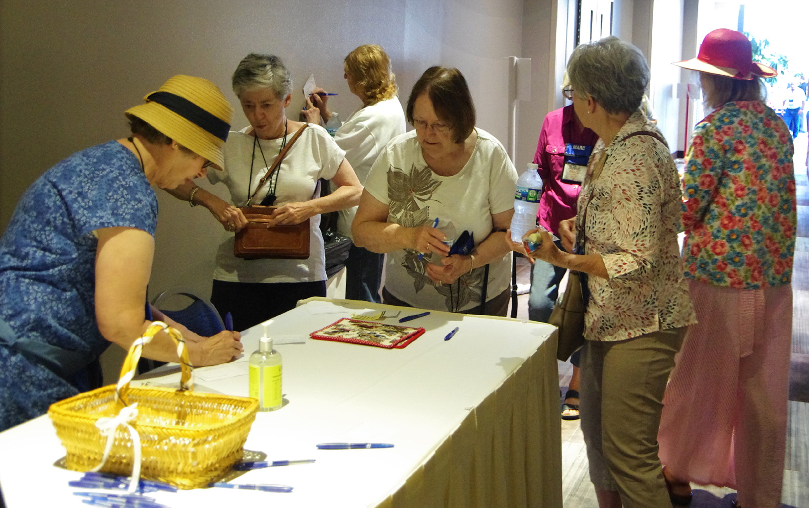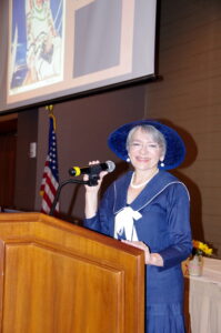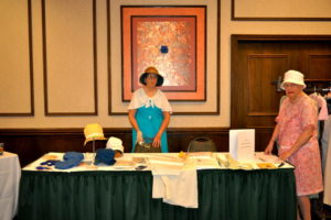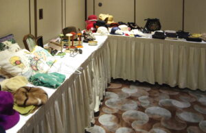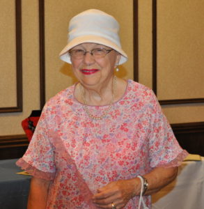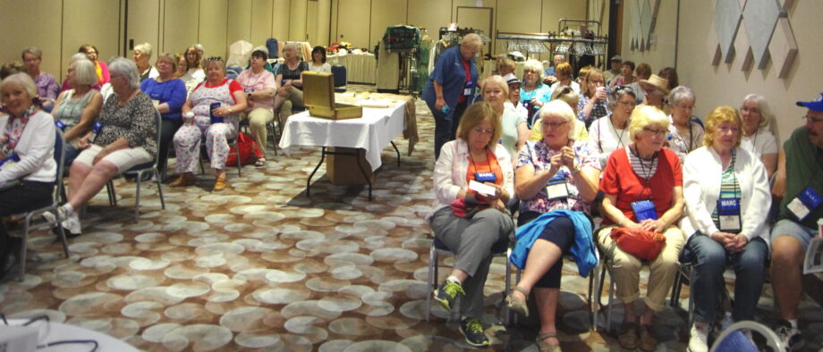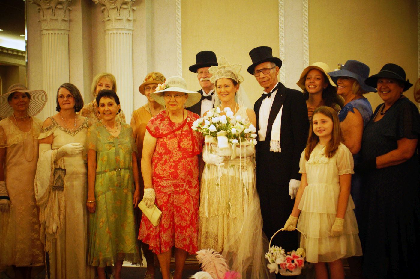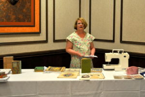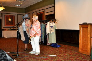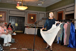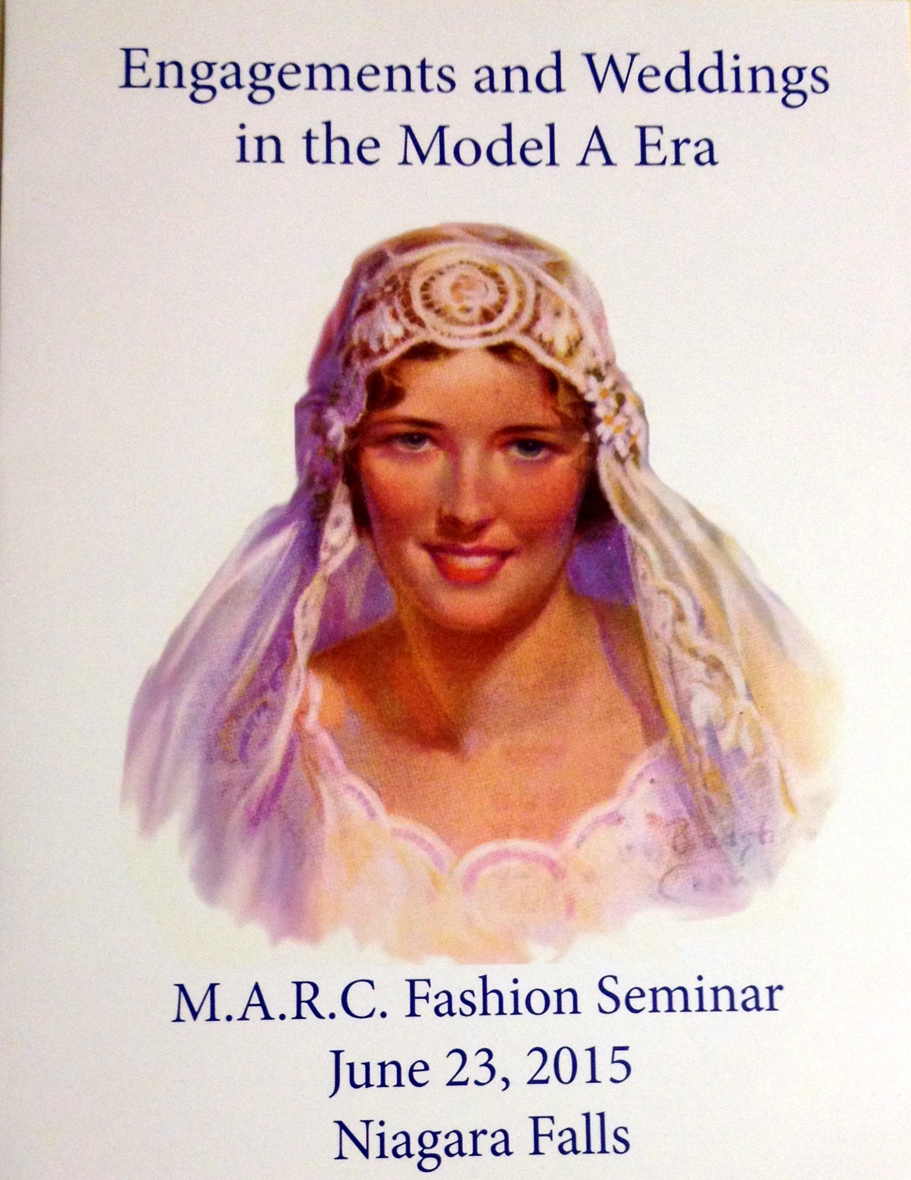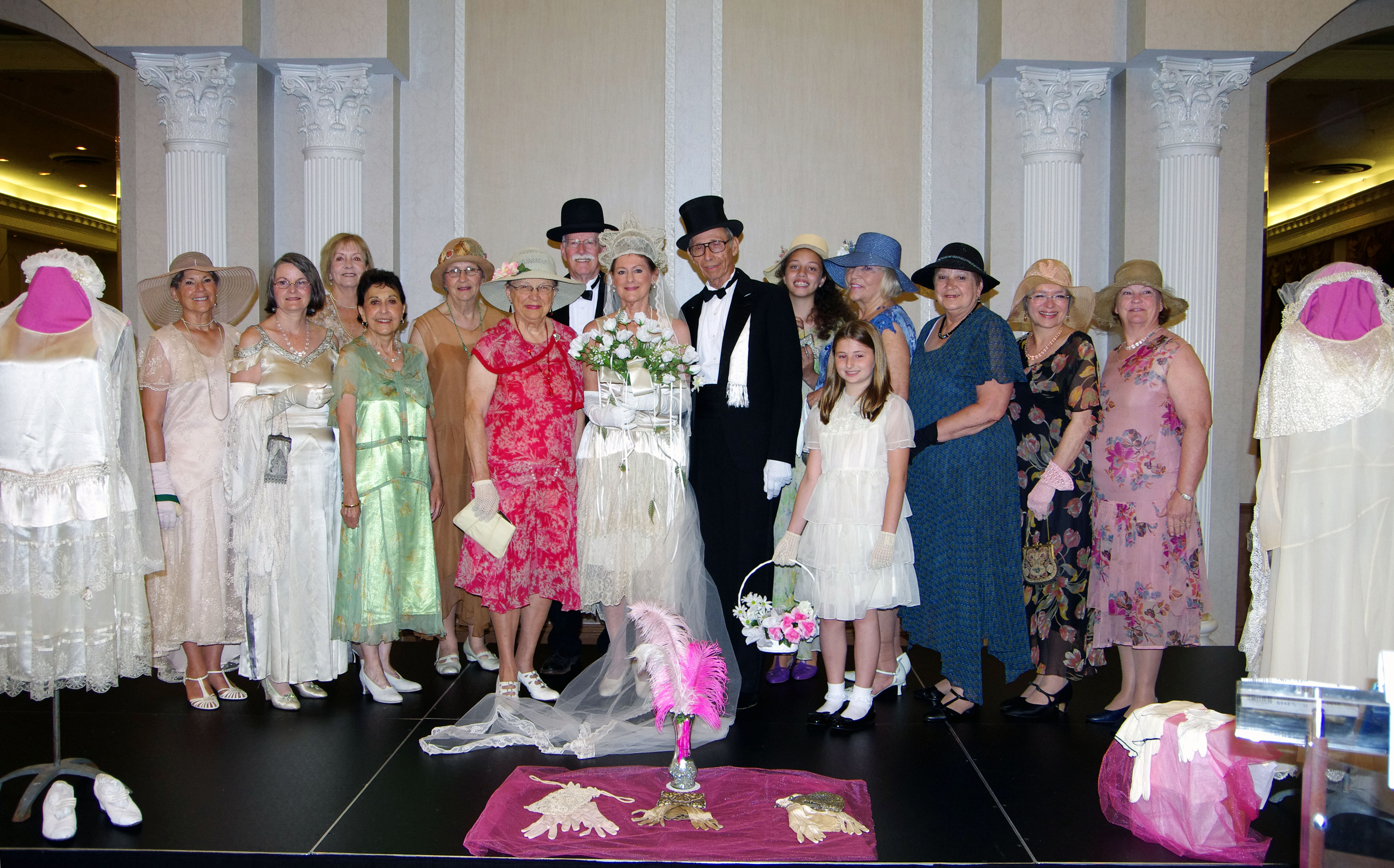 On Tuesday, June 23, the M.A.R.C. fashion committee presented a seminar on Weddings and Engagements.  The first part of the seminar was spent showing items related to engagements and weddings.  Era engagement and wedding rings were highlighted as well as the trousseau and wedding gifts.  The seminar culminated with a fashion show of era ensembles worn by guests, bridesmaids, mother of the bride, father of the bride, flower girl, and the groom.  Finally an original wedding dress worn by Mary Markes’ mother for her 1929 wedding was worn by Jackie Peinert.