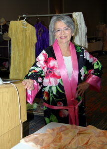 Fashion committee members, Ione Norton, Marilyn Krenger and Julie Kluttz display an original peignoir set from 1929.