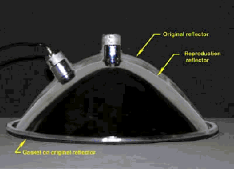 Method of photographic comparison: Camera set on tripod to maintain distance and perspective. Reflectors placed on the same spot (you can just see the pencil outline on the cardboard) and same rotation. I then used Adobe Photoshop Elements to remove the background from the picture of the repo reflector and then superposed it on the picture of the original reflector. Both pictures were exactly the same size and neither was changed to match the other. It’s a simple overlay once the background is removed from one. They were then “flattened” (combined) and then reduced in size to get the size below 100k.