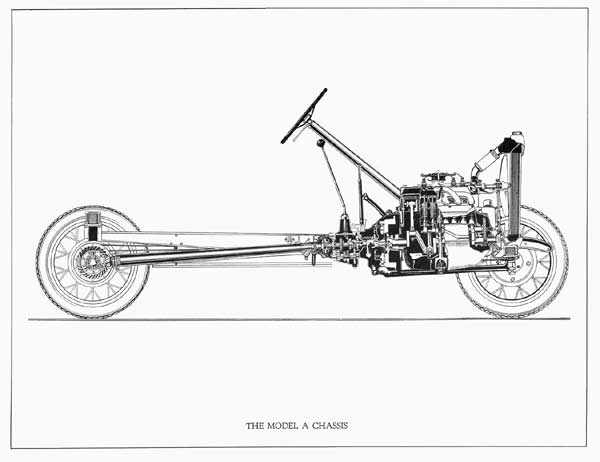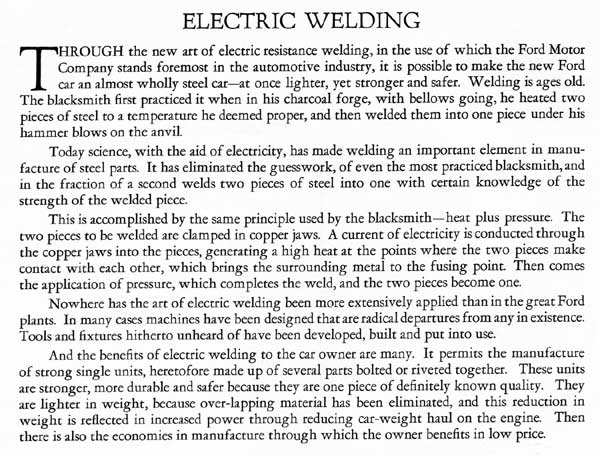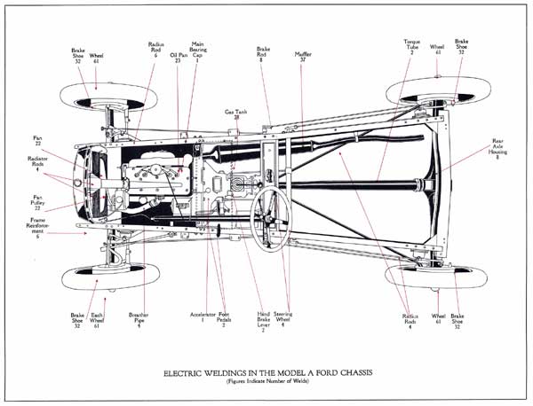 The rugged stamina of the Ford chassis is due largely to the extensive use of electric welding The bell forging of the rear axel housing is welded to axle shaft tubing, making it a solid piece of steel rather than separate units riveted together The model “A” is unique for its large number of electrically welded units