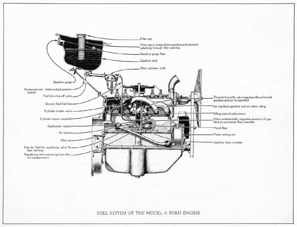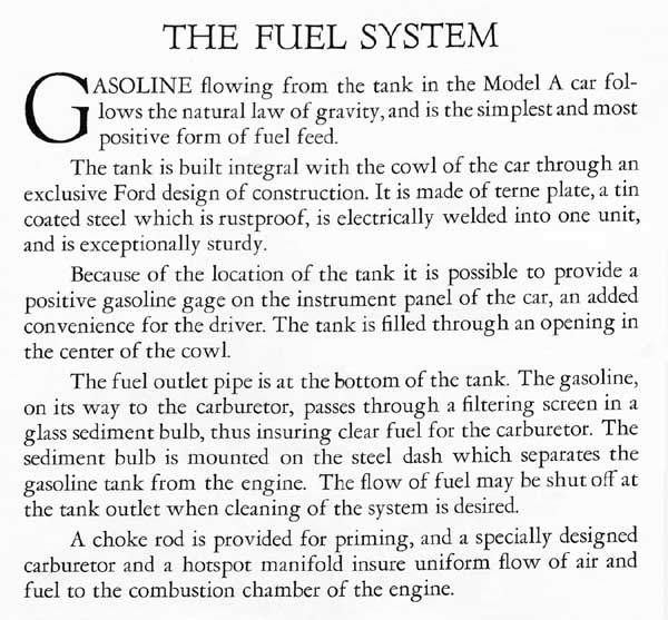 Heavy electrically welded one piece safety gas tank permits simple gravity flow to carburetor, eliminating necessity for fuel feed devices In aviation engines, where safety is of utmost importance, this practice is universally followed Position of Ford tank protects it and makes filling convenient