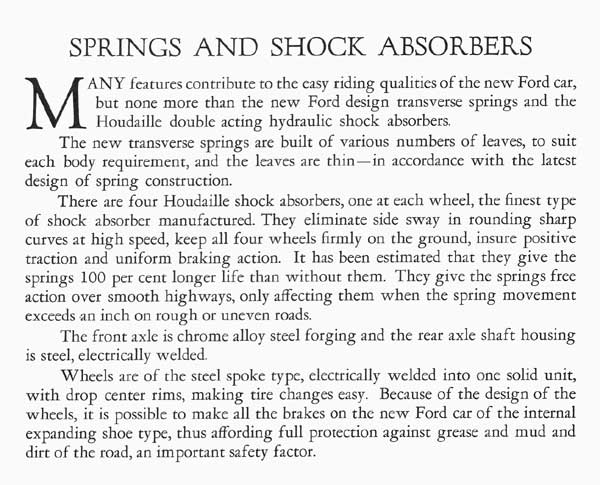 Houdaille hydraulic double acting shock absorbers control both upward and downward movement This equipment permits the use of more flexible springs, giving the softest and easiest riding qualities possible; also their effectiveness in controlling bouncing and swaying tendencies makes car travel safer at any speed Quickly adjustable to meet all kinds of driving conditions Standard equipment all around on all ford cars